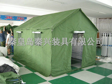 救灾用 12m2单帐篷为长方形双坡面直墙建筑样式。开门山墙上开三角窗一个;开窗山墙开三角窗一个,方形窗一个,两侧墙各开方形窗户两个。侧墙可支起成阳篷,整体帐篷通过拉绳拉起,用三角桩加固。符合民政部MZ/T 011.2-2010标准。